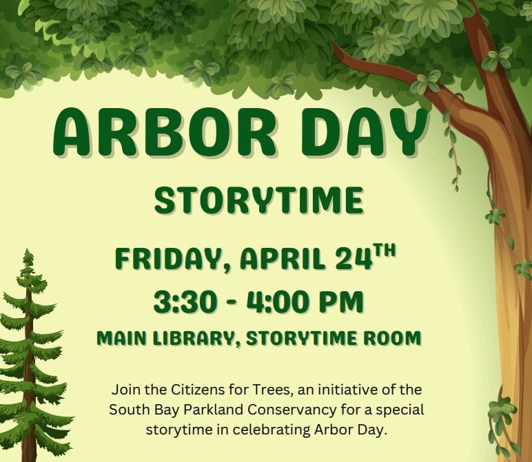 Join the Citizens for Trees, an initiative of the South Bay Parkland Conservancy for a special storytime in celebrating Arbor Day. Enjoy a reading and a craft in the Main Library Storytime Room.