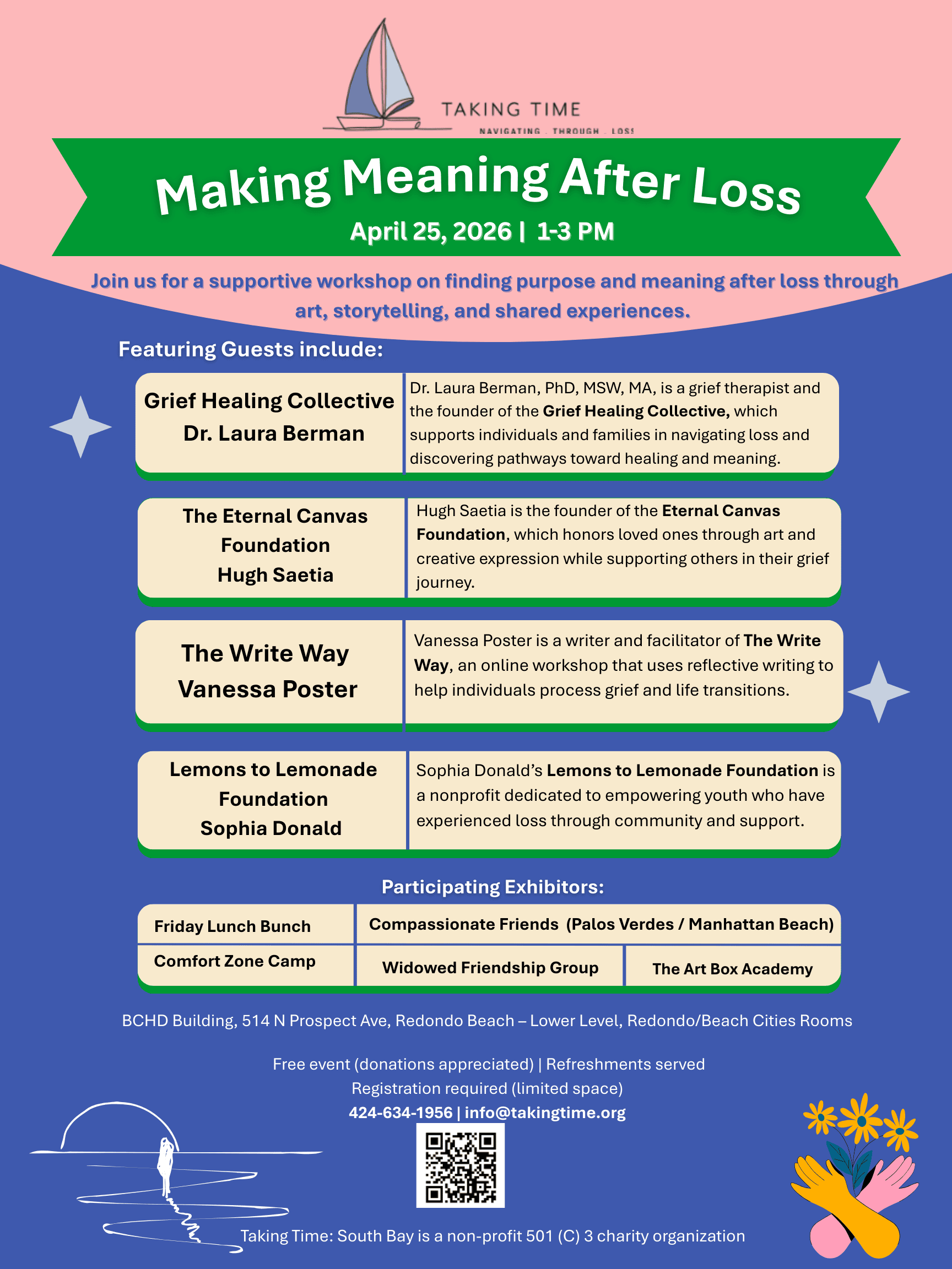 On April 25, Taking Time: South Bay is hosting Making Meaning After Loss, a free afternoon workshop bringing together grief professionals, artists, and writers to explore how creativity and connection can support the healing process. Whether you are early in your grief journey or years into it, this event is designed to meet you where you are.