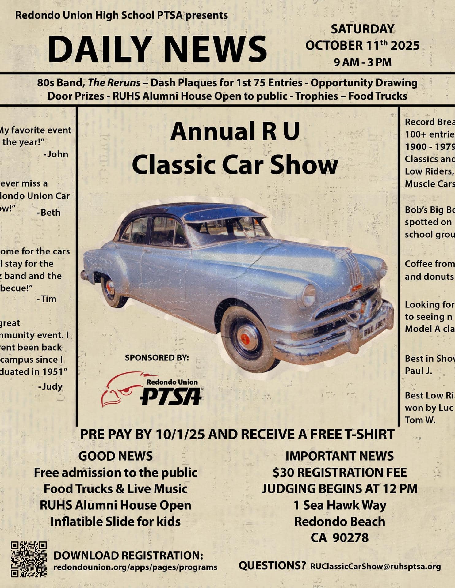 The Annual Redondo Union High School Classic Car Show brings together a wide mix of vintage and custom vehicles for a fun, family-friendly celebration. Attendees can enjoy classic cars, food trucks, live music from the 80s band The Reruns, dash plaques, trophies, and opportunity drawings while connecting with fellow car enthusiasts. Hosted by the RUHS PTSA, the event supports school programs and offers a lively day of community spirit and automotive history.