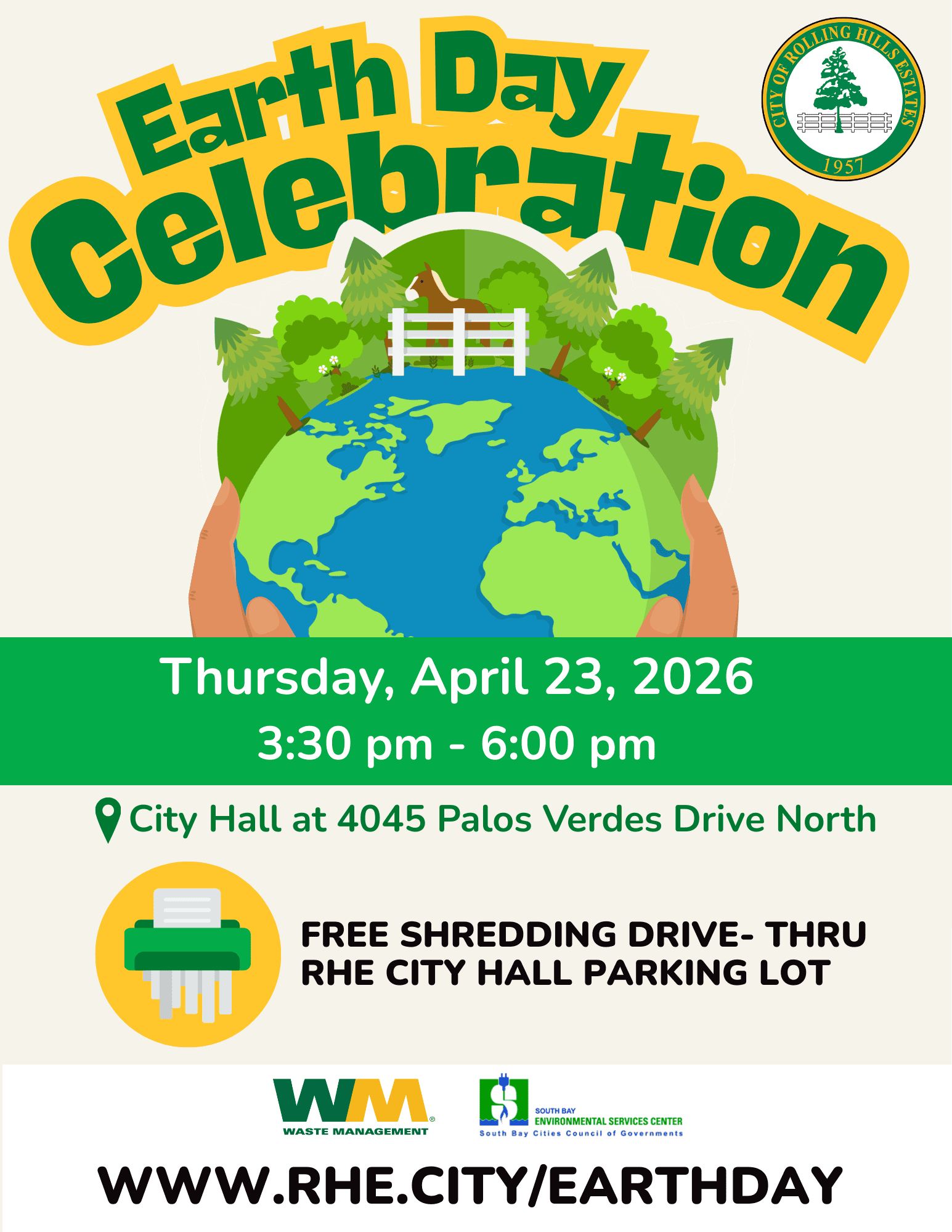 The City of Rolling Hills Estates in partnership with Waste Management, South Bay Environmental Services Center, is hosting an Earth Day Celebration on Thursday, April 23, 2026 from 3:30 p.m. to 6 p.m. at City Hall.