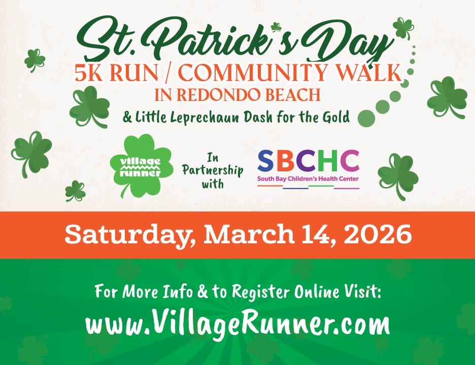 Join us at Village Runner St. Patrick’s Day 5K in beautiful Redondo Beach on Saturday, March 14, 2026, and this year, it’s extra special because we’re proud to partner with South Bay Children’s Health Center (SBCHC). All proceeds support our vital programs for local kids and families!